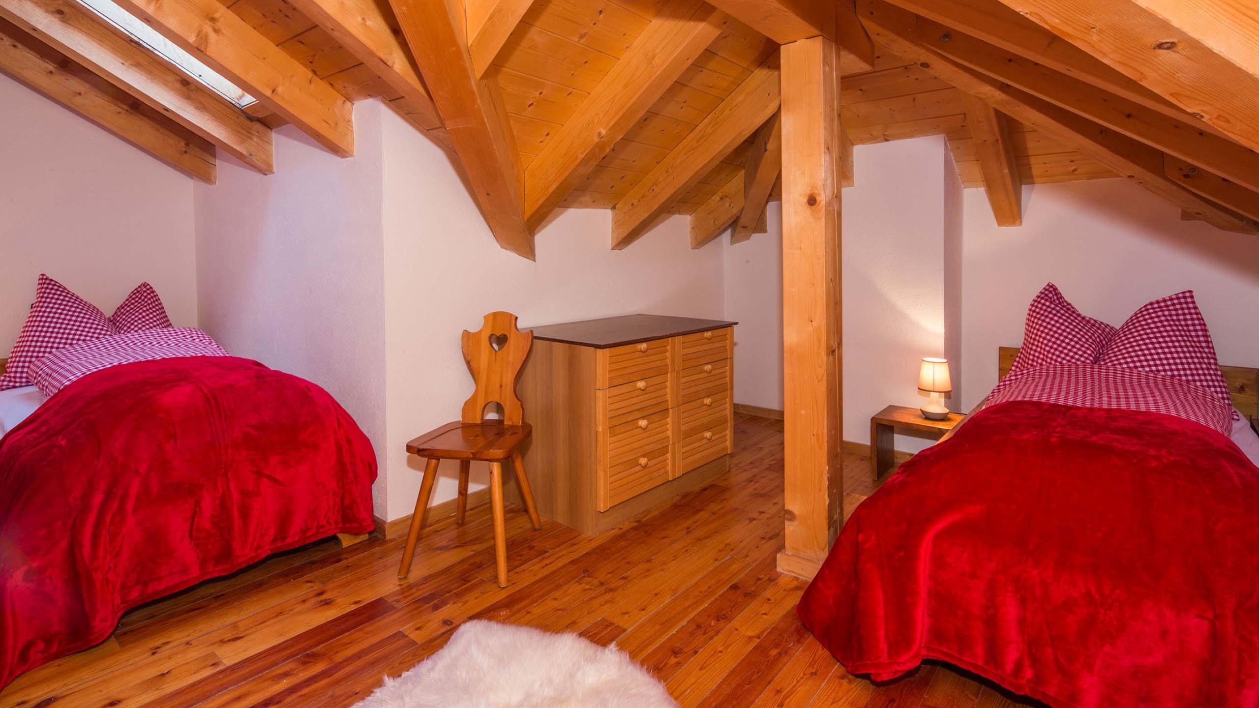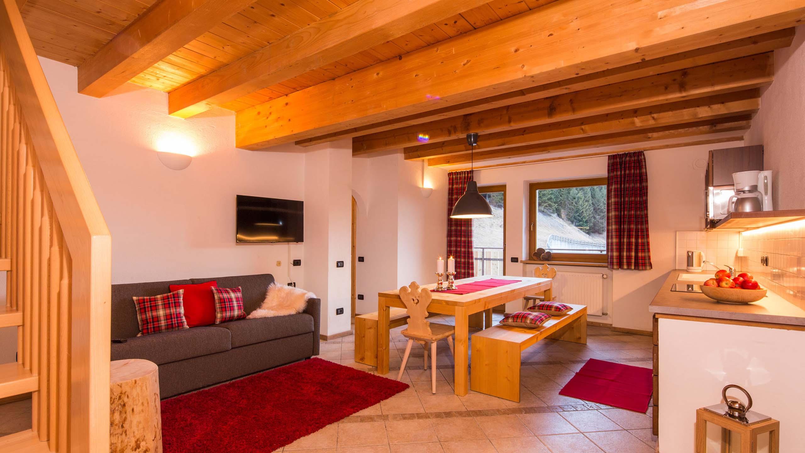 Spacious living unit on two floors in Tyrolean style for six to eleven people with a balcony. It includes a large kitchen with dining area and sofa bed, satellite TV, two double bedrooms, and a single bedroom on the same floor. On the second floor with romantic pitched roof, there are a double bed and two single beds. Plus: two bathrooms, one with bath and one with shower, toilet, and bidet.