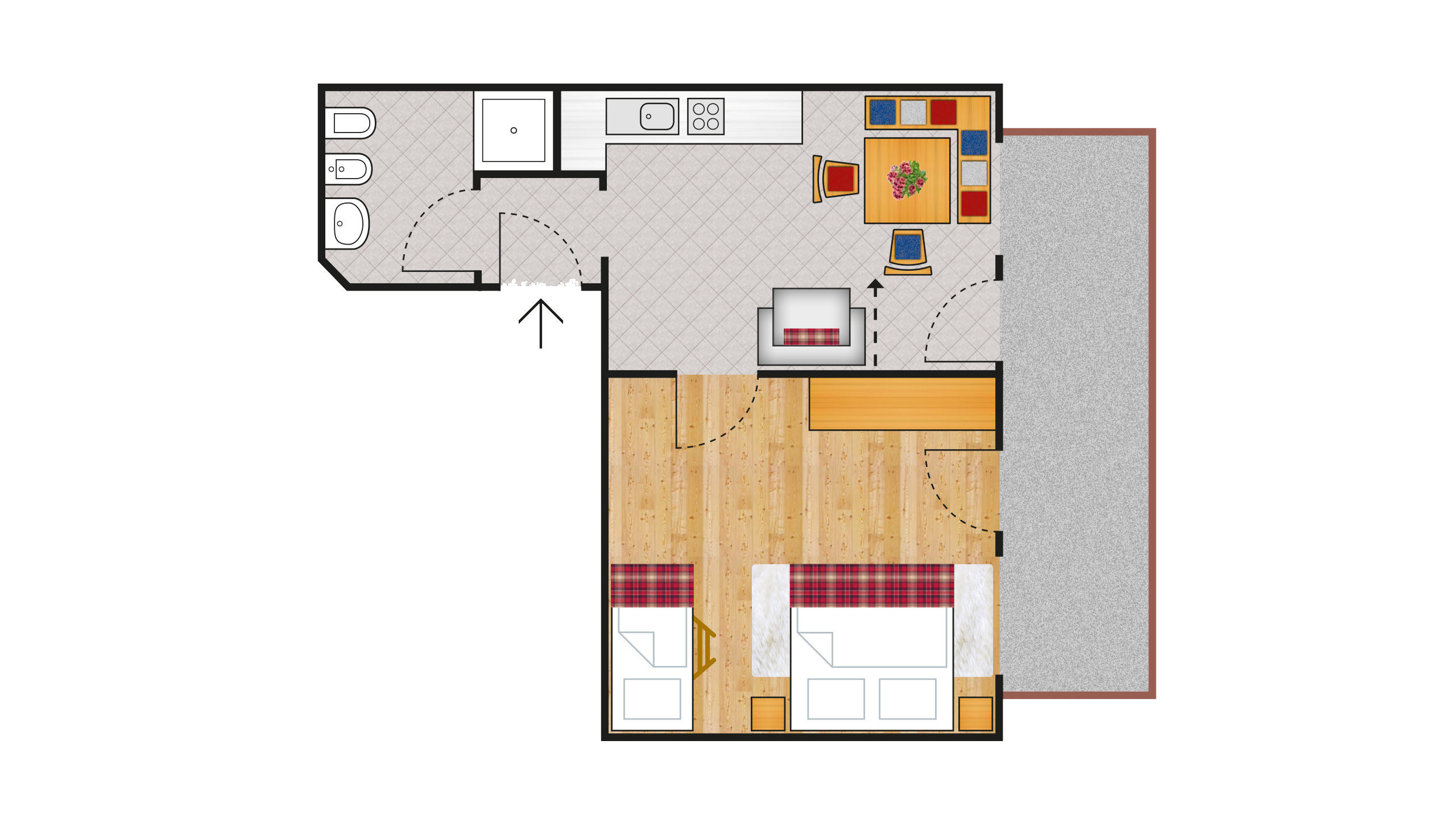 Cosy apartment in Tyrolean style for two to four people with a large panoramic balcony facing the river side. It includes a living room with sofa bed, satellite TV, dining area, kitchen, and a large bedroom with a double bed and a bunk bed, spacious bathroom with shower, toilet, and bidet.